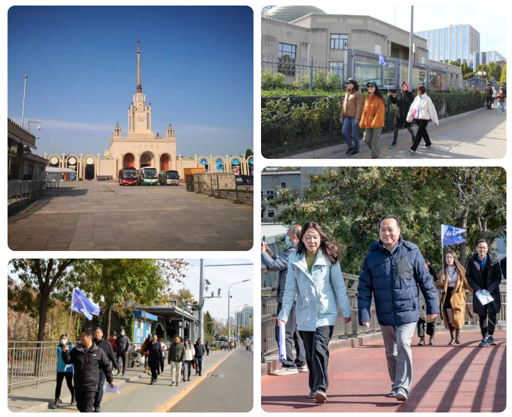 從三里河路一號院西苑飯店7號樓尚融資本總部出發,在各位領隊的引領下,健康走的隊伍踏上了這場歡快的徒步之旅。歡笑聲在秋風中回蕩,漫步穿越繁忙的都市,我們來到了第一站——北京展覽館。